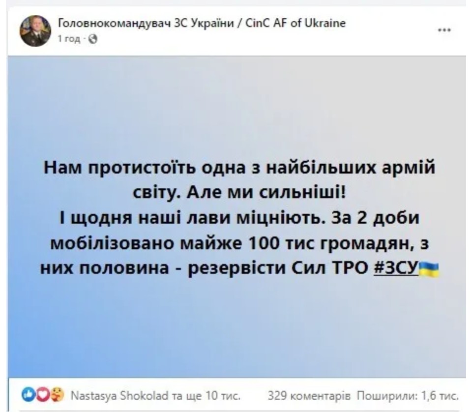 Про це у Facebook повідомив головком ЗСУ Валерій Залужний. Він зазначив, що Україні протистоить одна з найсильніших армій у світі, але ми сильніші.