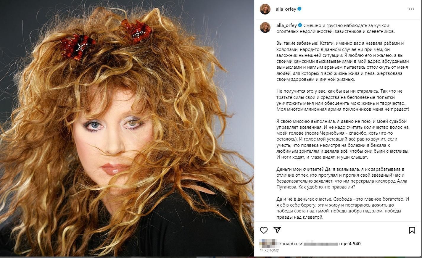 "Смішно і сумно спостерігати за купкою шалених недоособистостей, заздрісників та наклепників. Ви такі кумедні! До речі, саме вас я назвала рабами і холопами, народ у цьому випадку ні до чого, він заручник нинішньої ситуації. Я люблю його і жалію, а ви своїми хамськими висловлюваннями на мою адресу, абсурдними вигадками та нахабною брехнею намагаєтеся відштовхнути від мене людей, для яких я все життя жила та співала, жертвувала своїм здоров'ям та особистим життям. Я свою місію виконала, я давно не співаю, і моєю долею керує всесвіт. І не треба рахувати кількість волосся на моїй голові (після Чорнобиля – дякую, хоч щось залишилося). І голос мій втомлений все одно звучить, якщо врахувати, що півстоліття незважаючи на хвороби, я бігла до улюблених глядачів і робила все, щоб вони були щасливі", - наголосила Пугачова.