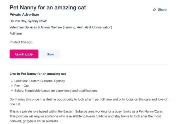 "Не пропустіть можливість, яка випадає раз у житті, повністю подбати про одного вихованця і зосередитися лише на турботі та любові до однієї кішки. Для цієї посади знадобиться хтось, хто готовий жити повний робочий день і залишатися вдома, щоб дбати про найулюбленішого, найпрекраснішого кота в Австралії. Вам буде надана власна кімната та всі зручності у чудовому та красивому будинку. Ця вакансія підійде лише для однієї людини, яка не має власного вихованця, враховуючи, що це вакансія з проживанням", - йдеться в оголошенні.