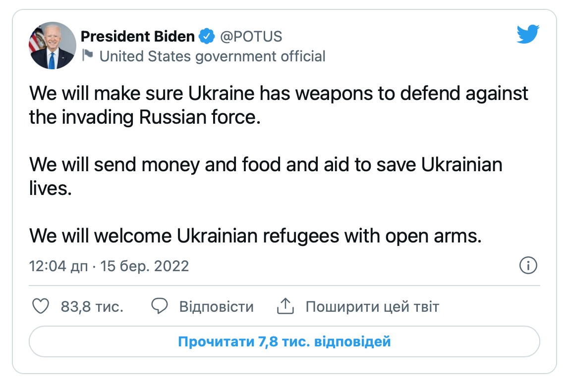 Байден: Ми дамо зброю Україні і приймемо біженців з відкритими обіймами