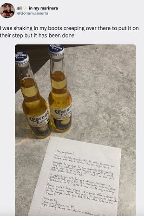 У зверненні йшлося: "Привіт, сусіди! Просто дружнє нагадування про те, що стіни між нашими будинками набагато тонші, ніж ви думаєте! Вітаю вас, друзі, з дуже здоровим сексуальним життям (серйозно, добре для вас). Проте, я б воліла не брати участі в цьому, і я впевнена, що ви обидва теж цього хотіли б. Я аплодую вам обом за вашу витривалість, проте дійшло до того, що це заважає моєму графіку сну, тому я вирішила, що настав час щось сказати. Будь ласка, прийміть це пиво як розмінну монету — я сподівався, що цього буде достатньо, щоб переконати вас пересунути своє ліжко в інший бік кімнати? З повагою, ваші сусіди з 83-ї".