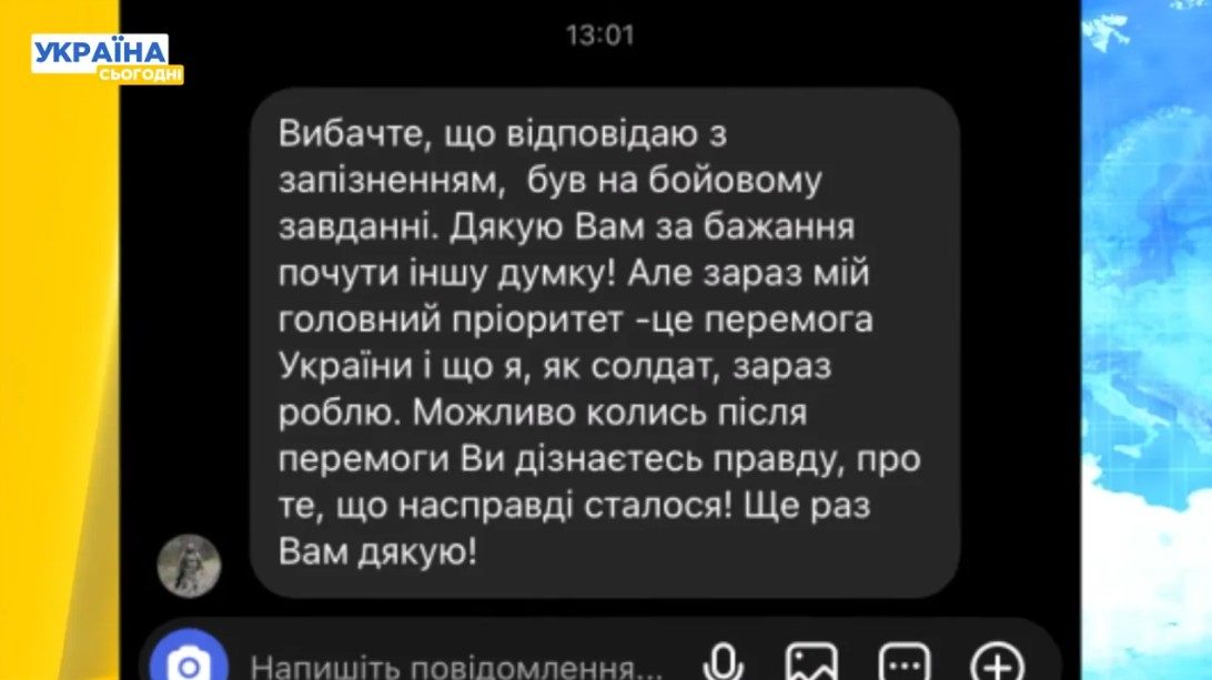 «Вибачте, що відповідаю із запізненням, був на бойовому завданні. Дякую вам за бажання почути іншу думку! Але зараз мій головний пріоритет — це перемога України і що я, як солдат, зараз роблю. Можливо колись після перемоги ви дізнаєтеся правду про те, що насправді сталося! Ще раз вам дякую», — написав він у відповідь на запит телеканалу прокоментувати звинувачення.