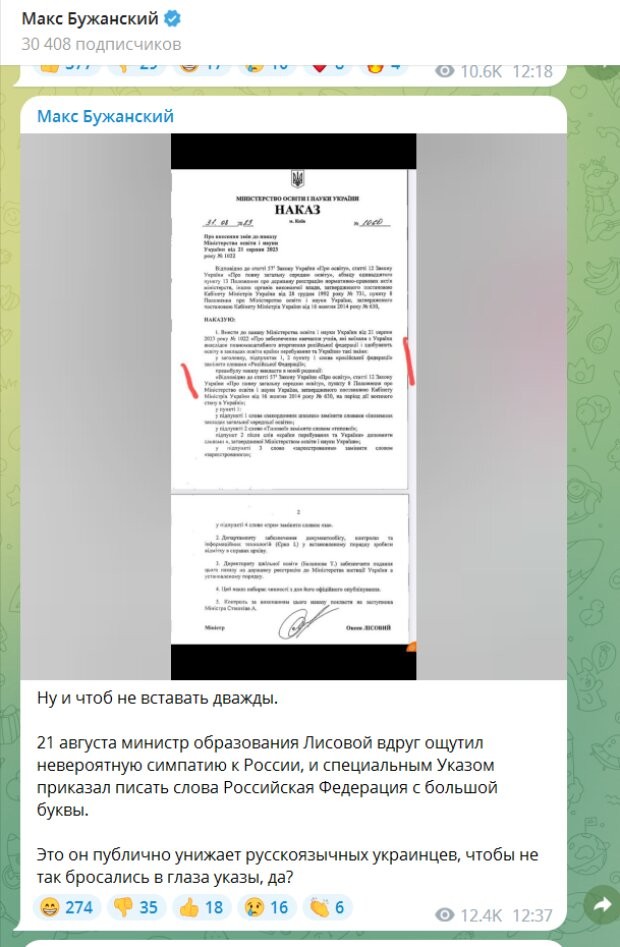 В ньому міністр зазначив, що потрібно писати слово російська федерація з великої літери, а якщо там слово написане з маленької – то це помилка, яку необхідно виправляти. Фото дійсного наказу опублікував у своєму телеграм-каналі депутат Макс Бужанський.