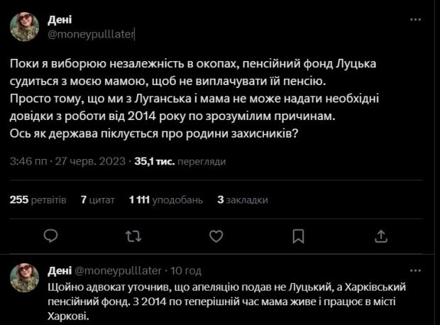 Вона зазначила, що поки вона на війні, пенсійний фонд судиться з її мамою, щоб не виплачувати їй пенсію.