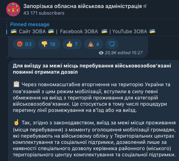 Це перша офіційна заява місцевого органу влади щодо обмежень та заборон в'їзду/виїзду за межі місця проживання (перебування) в умовах загальної мобілізації в Україні.