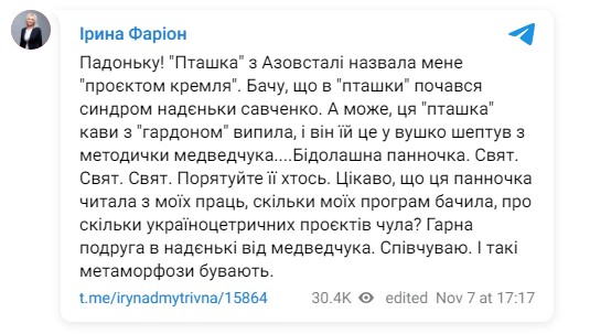 Бачу, що в "пташки" почався синдром надєньки савченко. А може, ця "пташка" кави з "гардоном" випила, і він їй це у вушко шептув з методички медведчука....Бідолашна панночка. Свят. Свят. Свят. Порятуйте її хтось, - написала Фаріон.