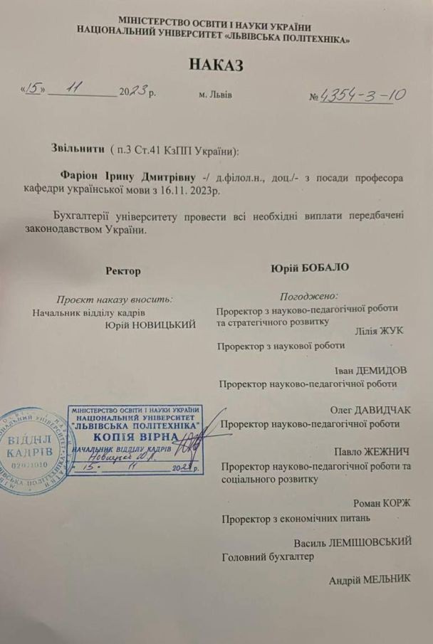 "Львівська політехніка звільнила Фаріон. Відповідний наказ вже підписано ректором. Студенти були, є і завжди будуть потужним рушієм змін та трансформацій. Позиція міністерства незмінна – людям, які не розділяють цінності гідності та не відчувають поваги до воїнів, немає місця в системі освіти", – каже очільник Міносвіти.
