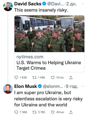 Мільярдер і власник Twitter Ілон Маск назвав допомогу США Україні зброєю, що здатна бити по окупованому Криму такою, що веде до "невпинної ескалації" та "вкрай ризикованою".