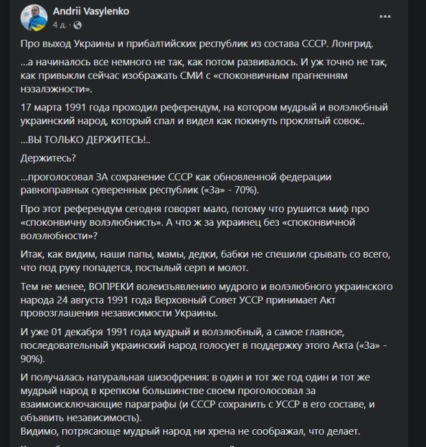 Окрім того, він поставив під сумнів бажання українців на початку 90-х вийти зі складу СРСР.
