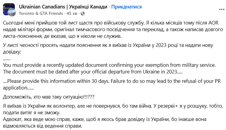 «Сьогодні мені прийшов той лист щастя про військову службу. Я кілька місяців тому після AOR (AOR — ключовий етап у будь-якому процесі імміграції або отриманні громадянства Канади. Це офіційне підтвердження від Імміграційної служби, Служби у справах біженців та громадянства Канади (IRCC) про те, що вони отримали вашу заяву та розпочали початкову обробку — Ред.) надав мілітарі форми, оригінал тимчасового посвідчення та переклад, а також написав довгого листа-пояснення, де вказав, що я ніколи не служив», — йдеться в повідомленні.
