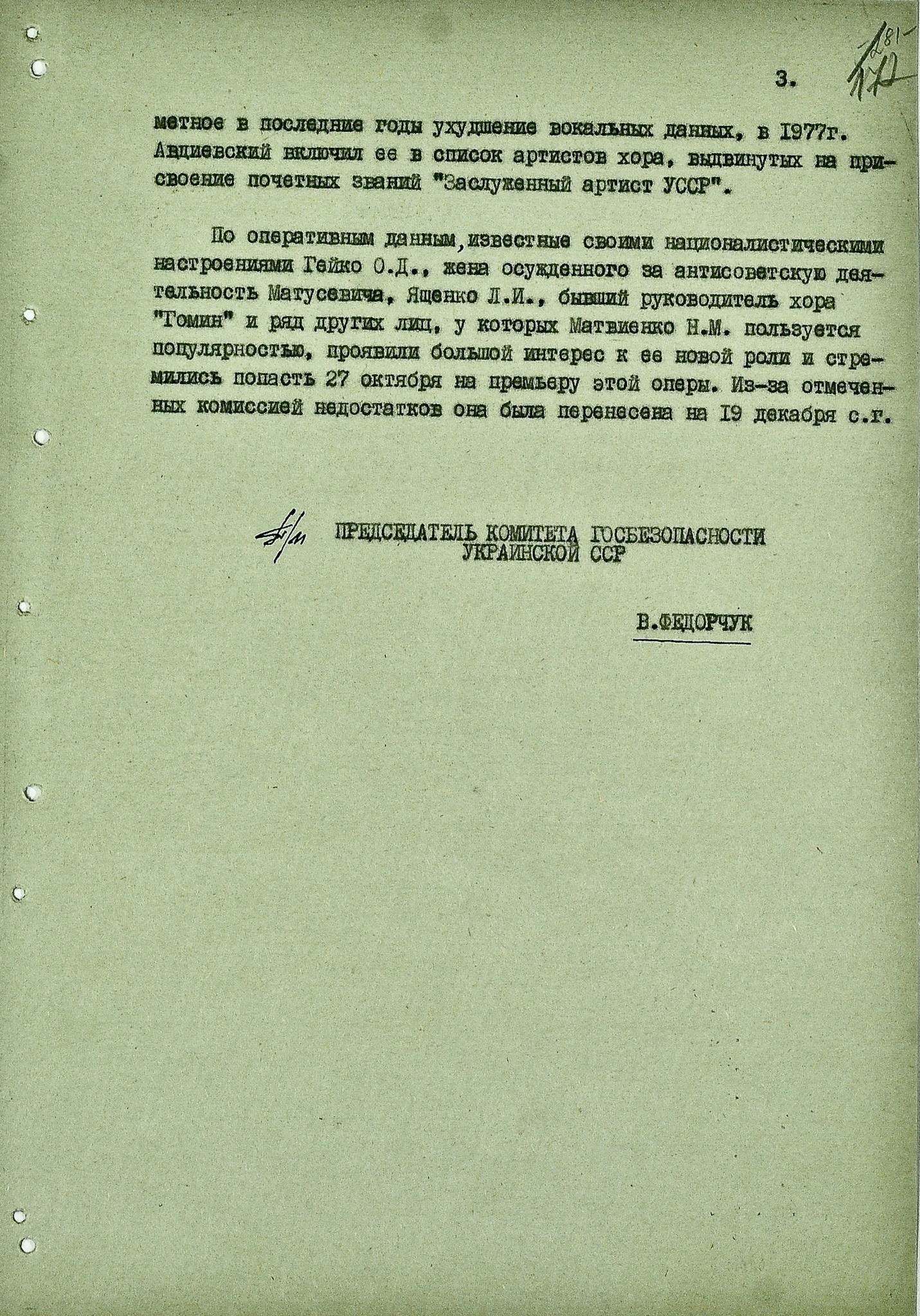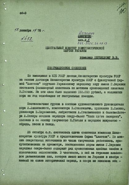 Ідеться про повідомлення, яке в грудні 1978 року КДБ УРСР склав та передав очільнику ЦК КПУ Щербицькому.