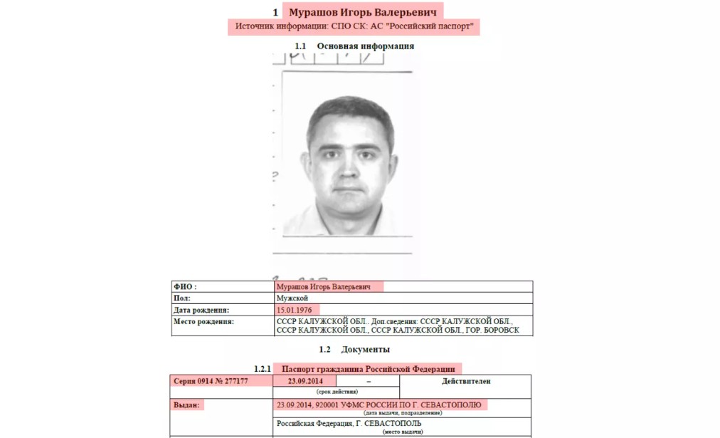 В одній з таких поїздок він став громадянином росії. hromadske від двох джерел отримало витяг з автоматизованої системи «роспаспорт». Згідно з ним, 23 вересня 2014 року Ігор Мурашов в окупованому Севастополі отримав паспорт із двоголовим орлом.