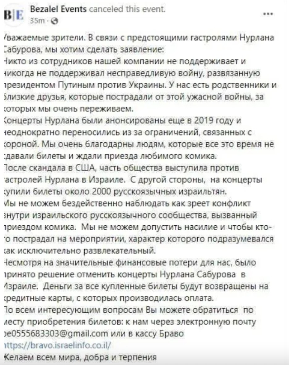 Крім того, компанія Bezalel Events заявила, що не підтримує війну в Україні і не хоче розпалювати ненависть між країнами. Тому було прийнято рішення про скасування концертів Сабурова в Ізраїлі.