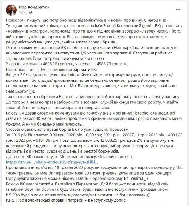 "Тут один заслужений співак, орденоносець на ім’я Віталій Козловський (далі – ВК) розносить "новину" про те, що я під час війни забираю "левову частку" його, військовослужбовця, зарплатні. Він, як завжди – обманює. Хоча про такого завзятого рецидивіста-обманщика доцільніше вжити слово "бреше". Отже, з моменту постановки ВК на облік в одну з частин Нацгвардії на мою користь згідно виконавчого впровадження стягується 1/5 частина його зарплатні. Стягування робиться згідно з законом. Їх же потрібно виконувати, чи не так? У серпні я отримав 4 608,26 гривень, у вересні – 4 586,70 гривень. Повторюю, це – 20% від нинішньої зарплати ВК", – вніс ясність Кондратюк.