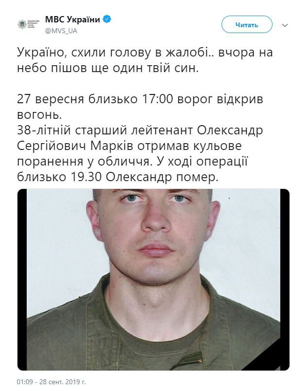 У п'ятницю, 27 вересня, в результаті обстрілу в зоні проведення ООС в Донбасі загинув старший лейтенант Олександр Марків