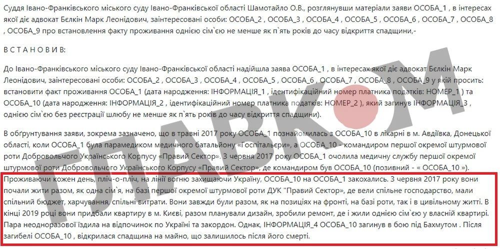 Окремо суд зробив важливий акцент. Після встановлення факту проживання однією сім’єю заявниця тобто Аліна Михайлова матиме право претендувати на одноразову грошову допомогу на суму 15 млн грн поряд з іншими близькими загиблого воїна.
