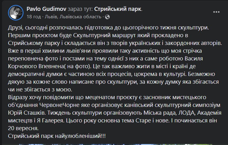 «Вже в перші хвилини львів’яни проявили таку активність що моя стрічка переповнена фото і постами на тему однієї з них, а саме роботою Василя Корчового «Впевнена». Це так важливо жити в місті та країні, де демократичні думки є частиною всіх процесів, зокрема в культурі. Безмежно дякую за кожне слово, написане про скульптури, за кожну думку, яка збігається чи не збігається з моєю», ‒ написав Гудімов.
