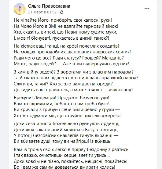 У тексті, що належить якійсь Ользі Православній, українців, які виступають проти МП, називають "беснуватими", а також порівнюють їх з "іудами".