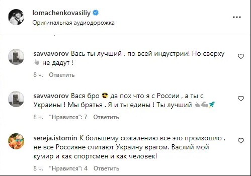 "Вася, все одно, що я з Росії, а ти з України! Ми брати! Я і ти єдині! Ти найкращий", "На превеликий жаль все це сталося, не всі росіяни вважають Україну ворогом. Василь мій кумир і як спортсмен і як людина!", "Вася ми росіяни, з нами Бог! А ваша влада це біси", - підтримують Ломаченко росіяни.