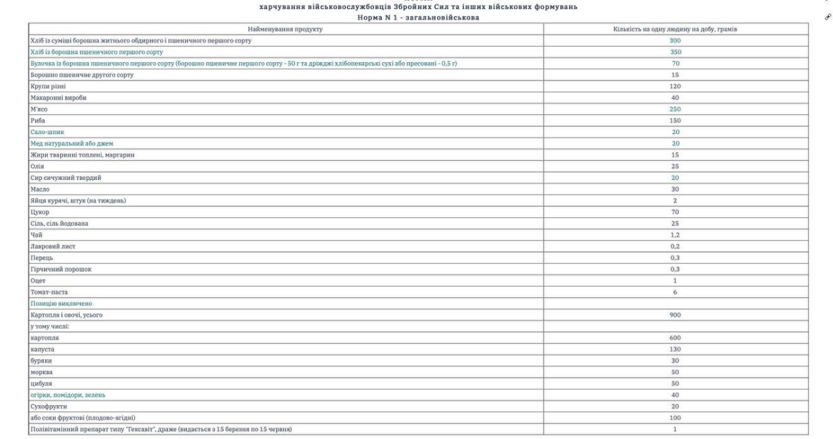 Згідно з документом, для армії закуповували мінімальний намір харчів: хліб, крупи, чай, консерви, базові овочі, яйця, макарони, а категорії «м'ясо і риба» не містила ніяких додаткових вимог. Тож годували військових одною найдешевшою куркою та мороженим хеком.
