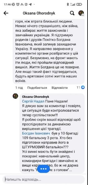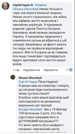 "Богдан був призваний у 2-й половині січня 2023 року шляхом примусового вручення запрошення та доставки до ТЦК на зупинці громадського транспорту у м. Тернопіль. Навчання боєць у навчальній частині та на полігоні не проходив. Він не проходив навчання поводженню зі зброєю. В армії – не служив. Результат – 16 лютого 23 роки немає Богдана, немає друга, немає сина, немає коханої людини. Пройшов місяць від вручення повістки. Ганьба всім відповідальним особам – це буде на вашій совісті!" – заявила Огородник.