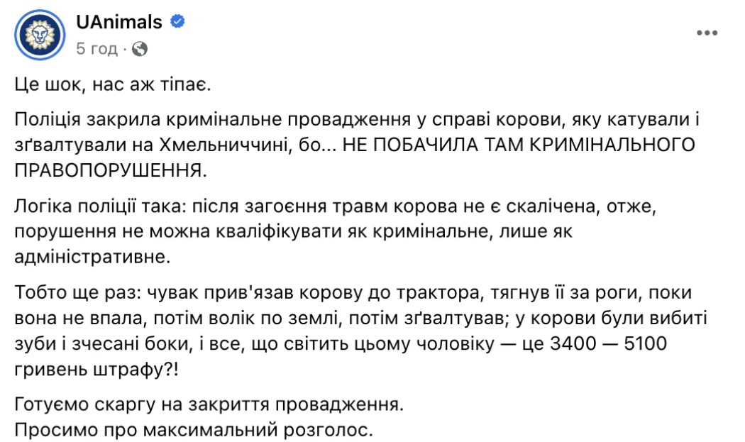 "Логіка поліції така: після загоєння травм корова не є скалічена, отже, порушення не можна кваліфікувати як кримінальне, лише як адміністративне", – зазначили там.
