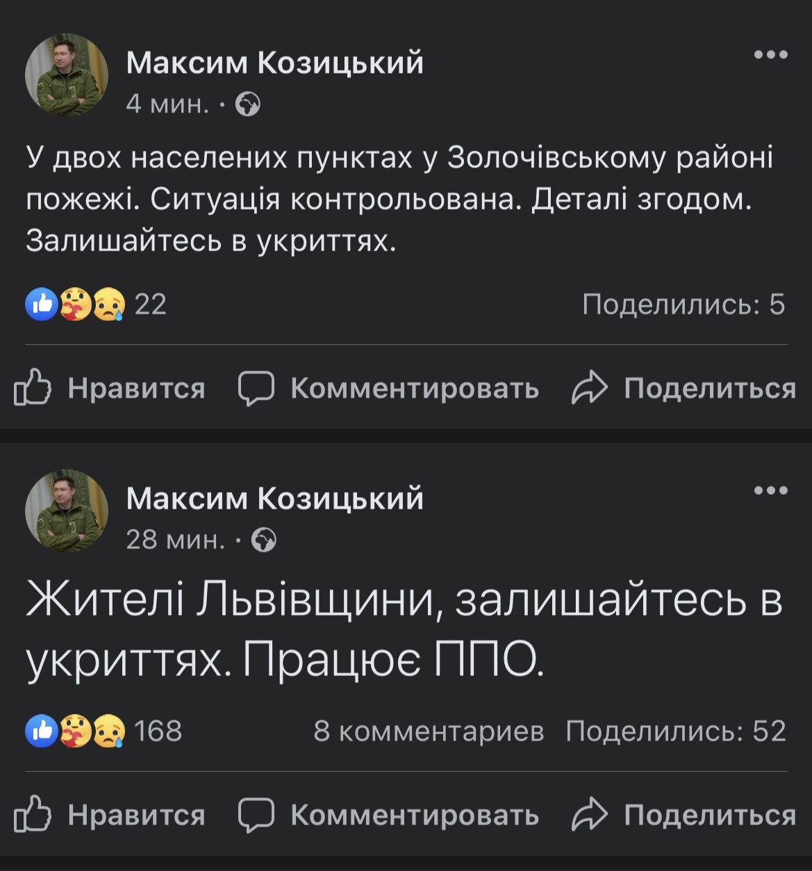 08:50 У двох населених пунктах у Золочівському районі пожежі. Ситуація контрольована. Деталі згодом. Залишайтесь в укриттях. - повідомляє Максим Козицький голова Львівської ОВА