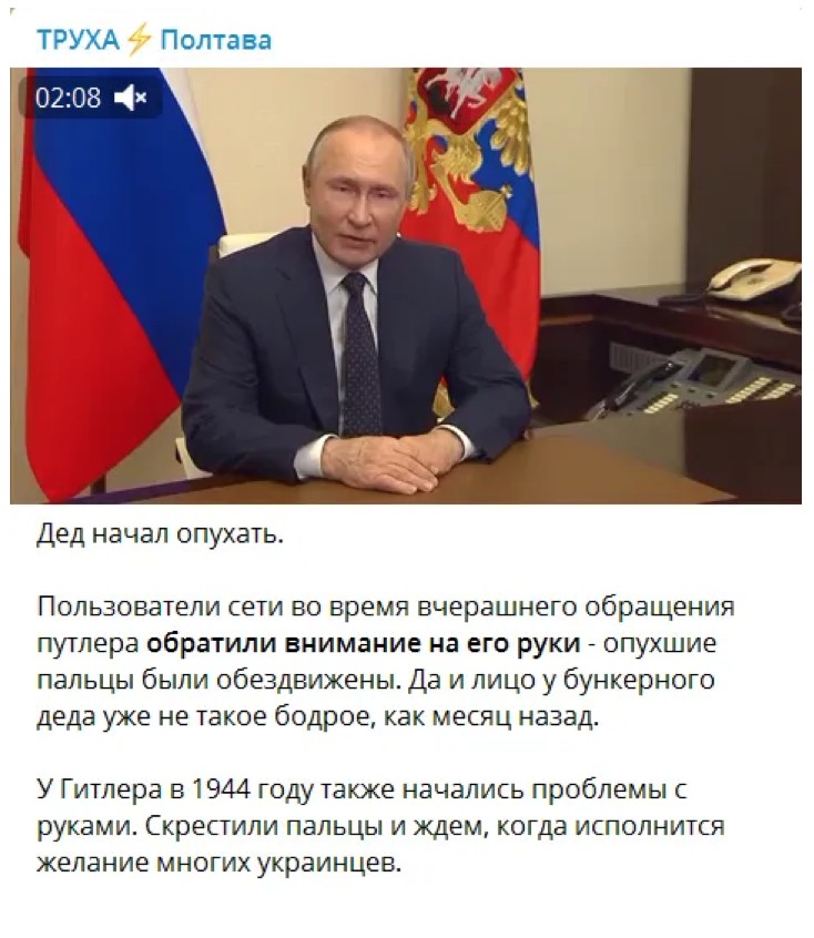Так, користувачі зазначають, що "опухлі пальці" Путіна, судячи з відео, знерухомлені. "Та й обличчя в бункерного діда вже не таке бадьоре, як місяць тому", – пише "Труха".