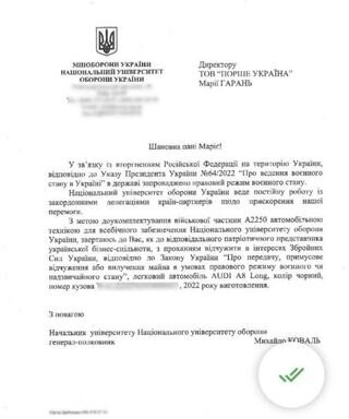 Начальник Національного університету оборони, генерал-полковник Михайло Коваль звернувся до ТОВ «Порше Україна» з запитом передати на потреби ЗСУ дорожезний легковик AUDI A8 Long за 150 тис. дол.