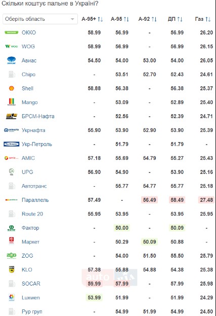 Ціни на пальне по Україні відрізняються, залежно від мережі АЗС. Вартість бензину А-95 коливається від 50 до 57,99 грн/л, а бензину А-92 – від 50,09 до 56,49 грн/л.