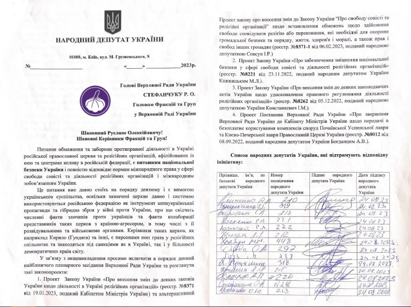 Рух «Чесно» опублікував список народних депутатів, які станом на 24 серпня 2023 року підписали звернення до голови Верховної Ради з проханням розглянути законопроєкти щодо ліквідації УПЦ МП.