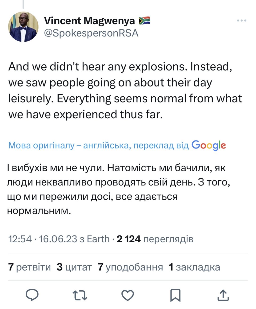 “І вибухів ми не чули. Натомість ми бачили, як люди неквапливо проводять свій день. З того, що ми пережили досі, все здається нормальним”, — заявив Магвенья.