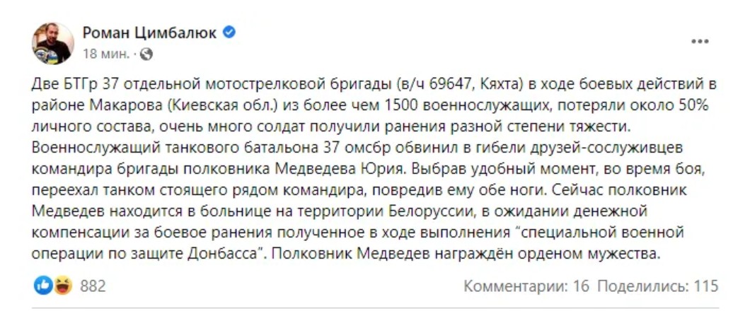 "Військовослужбовець, обравши зручний момент під час бою, переїхав танком командира бригади полковника Юрія Медведєва, пошкодивши йому обидві ноги", – написав журналіст.