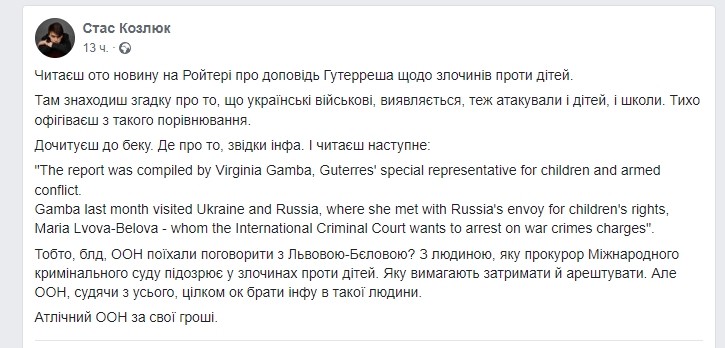 "Читаєш новину про доповідь Гутерреша про злочини проти дітей. Там знаходиш згадку, що українські військові, виявляється, теж атакували і дітей, і школи. Тихо офігіваєш такому порівнянню. Де про те, звідки інфа. І читаєш: Доповідь склала Вірджинія Гамба, спеціальний представник генсека ООН з питань дітей та збройних конфліктів. Минулого місяця Гамба зустрілася з уповноваженою РФ з прав дитини Марією Львовою-Бєловою.Тобто, ООН поїхали поговорити зі Львовою-Бєловою? З людиною, підозрюваною прокурором Міжнародного кримінального суду у злочинах проти дітей. Яку вимагають затримати та заарештувати. Але ООН, зважаючи на все, цілком ок отримувати інформацію в такої людини", - написав Козлюк.