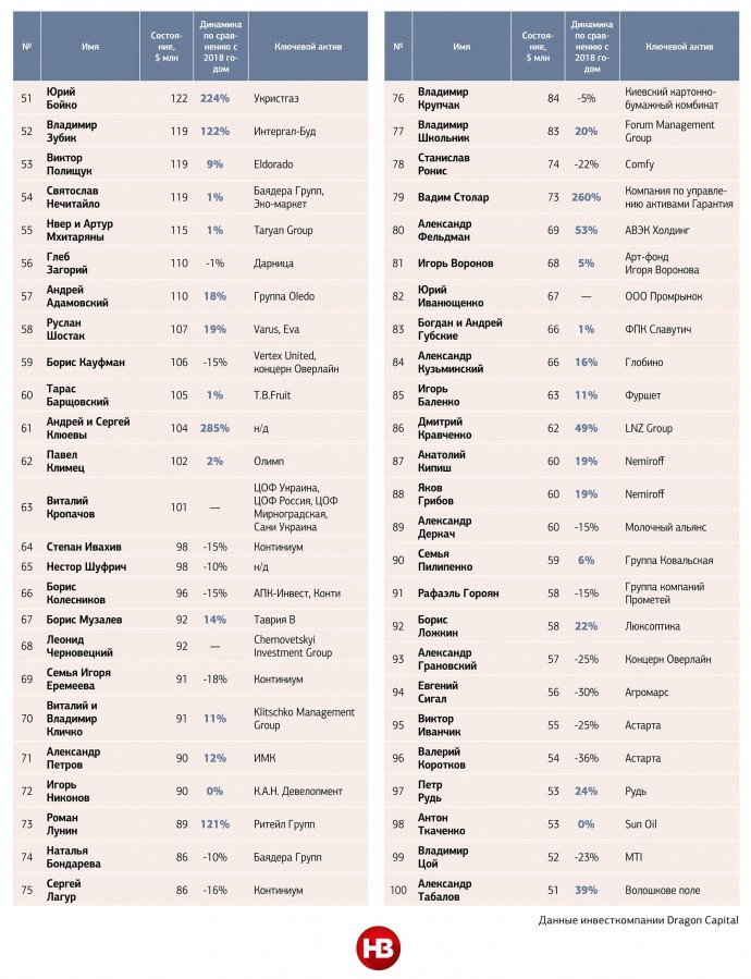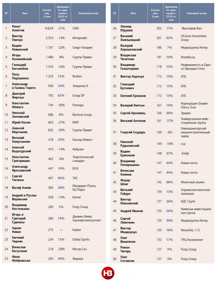 Перші позиції, як і минулого року, посіли Рінат Ахметов, Віктор Пінчук і Вадим Новинський. П’ятірка найбагатших українців за рік втратили $3,8 млрд