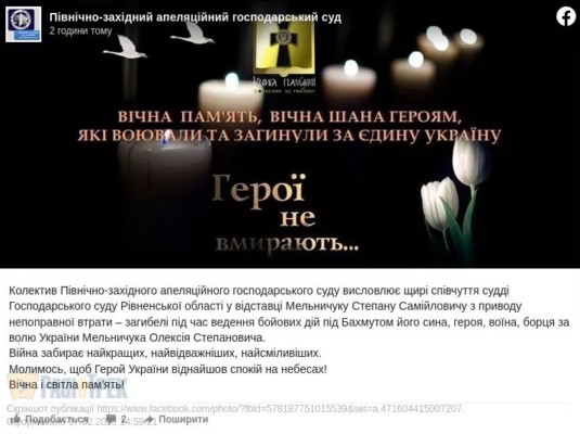 Під час ведення бойових дій під Бахмутом на Донеччині загинув Олексій Мельничук – син судді Господарського суду Рівненської області у відставці Степана Мельничука.