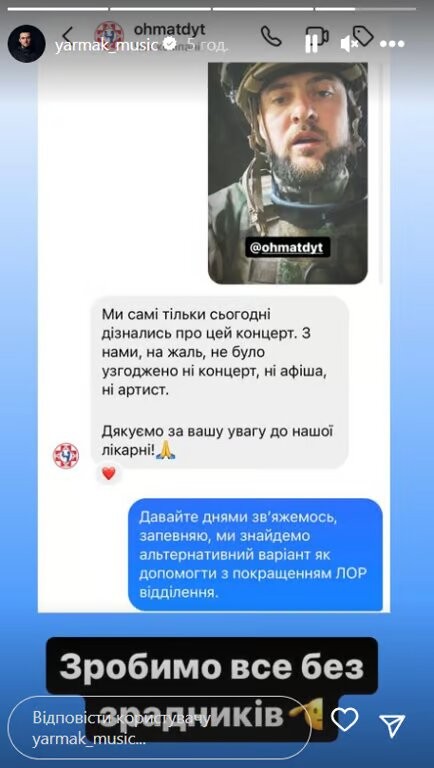 "Це ганьба. Потихеньку з’являється відчуття дежавю 2015 року, коли нам починають просувати "какая разница". Звісно, ми будемо реагувати на це більш впевненіше, ніж раніше. Допомогти ЛОР-відділенню можна багатьма іншими способами", — сказав у відео Ярмак та відмітив профайл дитячої клініки.