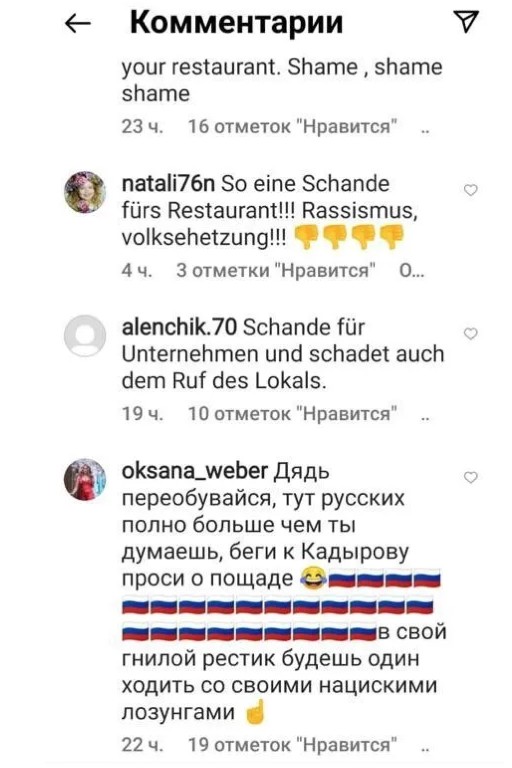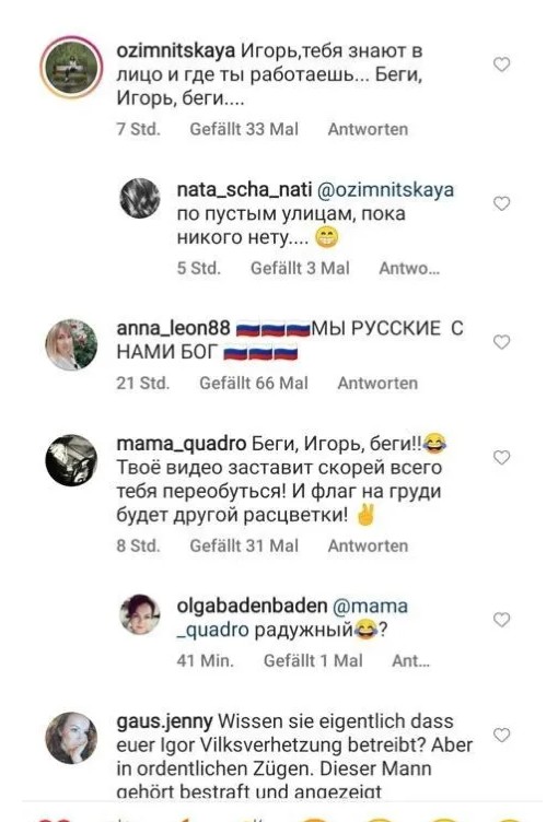 "Припускаю, що саме хтось із них найняв ботів, які стали приходити на сторінку ресторану в Instagram і писати там негативні відгуки. Вони звинувачували мене в расизмі, хоча ніякого расизму в моїх словах не було. Я сам говорю російською мовою, я родом з Одеси, моя мама з Петербурга, батько білорус. Я просто попередив росіян, що далеко не всі їм тут раді. На підбирання висловлювань часу в мене не було. Баден – багатонаціональне спокійне місто, але у великих містах у них можуть бути проблеми. Тільки на третій день я дізнався, що мої слова викликали раптом таку реакцію. Я спеціально переглянув, хто писав коментарі, можу сказати, що 90% там були боти. Приблизно 200-300 повідомлень з'явилися майже одночасно", – каже Ігор.