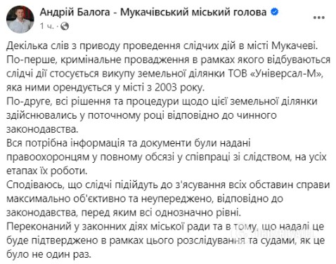 Він написав, що обшуки стосувалися викупу земельної ділянки ТОВ "Універсал-М", яка орендувалася з 2003 року.