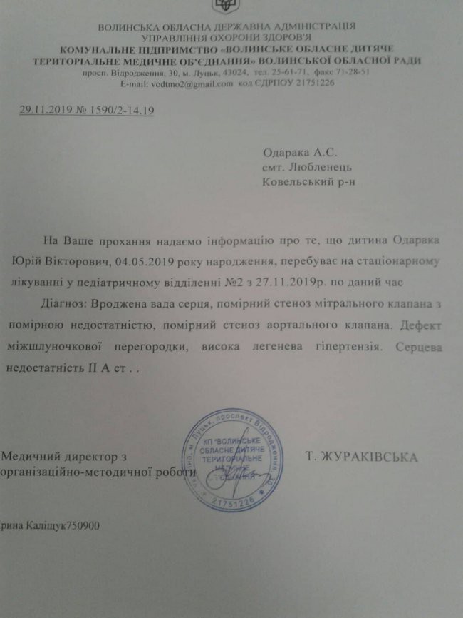 Раніше немовля лікували у Волинській обласній дитячій клінічній лікарні. Зараз він із мамою – у кардіоцентрі в Києві. Тут йому провели операцію, вставили штучний клапан.