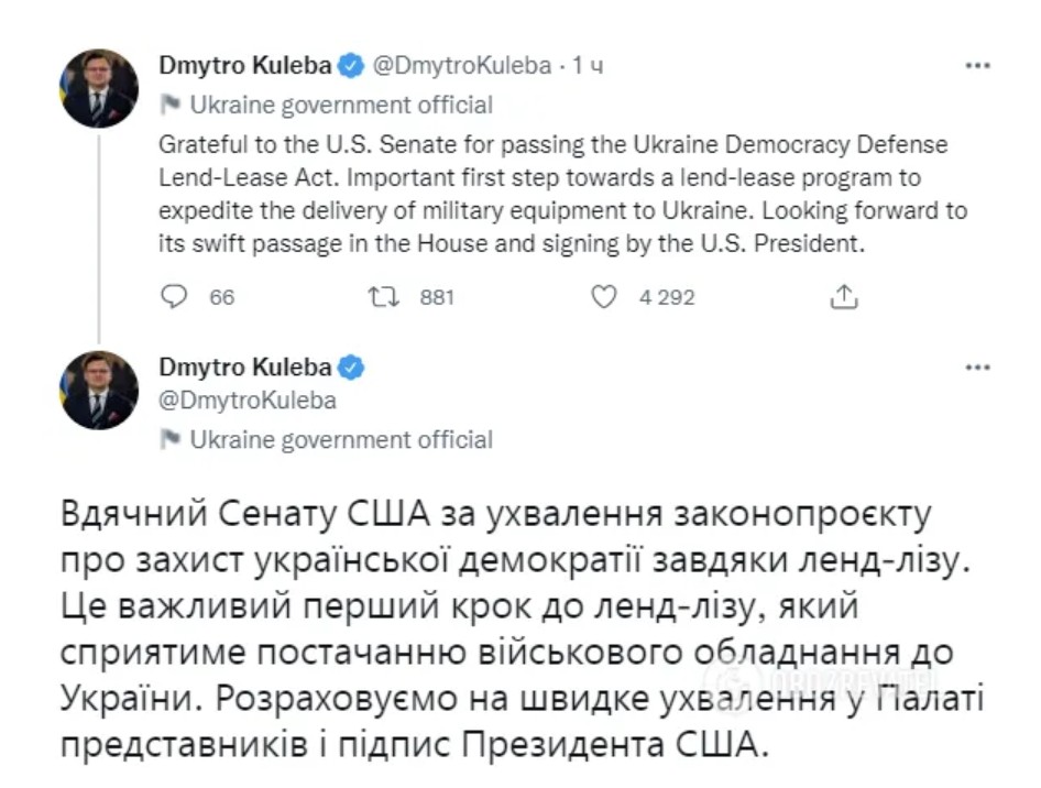 Міністр закордонних справ Дмитро Кулеба подякував Сенату за ухвалення цього законопроєкту. "Це важливий перший крок до ленд-лізу, який сприятиме постачанню військового обладнання в Україну. Розраховуємо на якнайшвидше ухвалення в Палаті представників і на підпис президента США", – написав він.