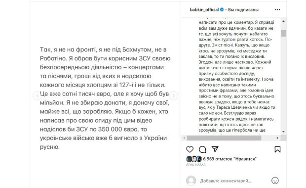 "Це не радіо в маршрутці, якщо не хочеш слухати - не слухай. Але тисячі людей, яким було начхати на всі інші пісні, прийшли і написали, що пісня і я - л*йно, і що як я можу, якщо я не на фронті, не в Харкові, не в Україні, а хоч би і в Україні, неважливо, якщо тварюка, яка щось не те співає", — поскаржився Бабкін.