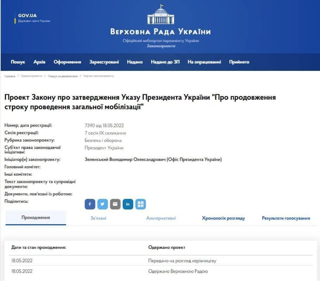 У Верховній Раді України 18 травня зареєстрували проєкти законів про продовження воєнного стану в Україні після 24 травня та про продовження загальної мобілізації.