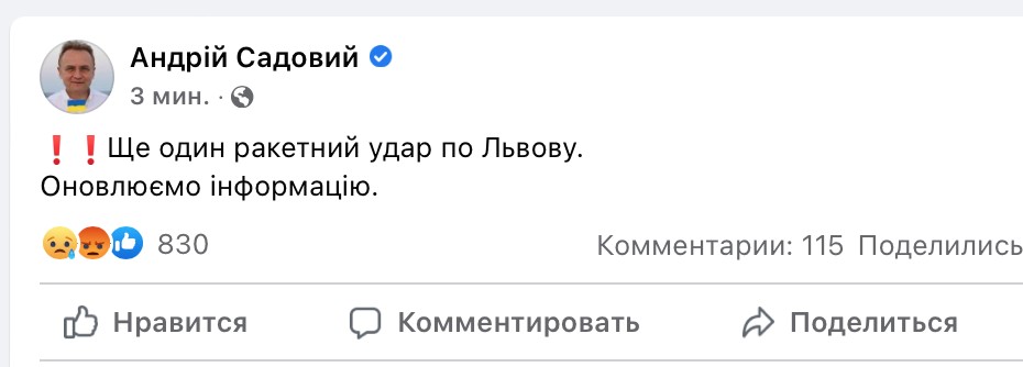 Оновлюємо інформацію. повідомляє мер Львова у фейсбук.