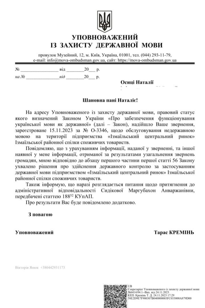 Так, Наталія звернулася до Уповноваженого із захисту державної мови Тараса Кременя. У відповіді йдеться про те, що ухвалено рішення про здійснення державного контролю за застосуванням української мови на Ізмаїльському центральному ринку відповідно до першого абзацу частини 1 статті 56 Закону України «Про забезпечення функціонування української мови як державної».Тарас Кремінь підкреслив, що це рішення прийнято на підставі інформації, наданої Наталією Осикою, і результатів інших звернень громадян.