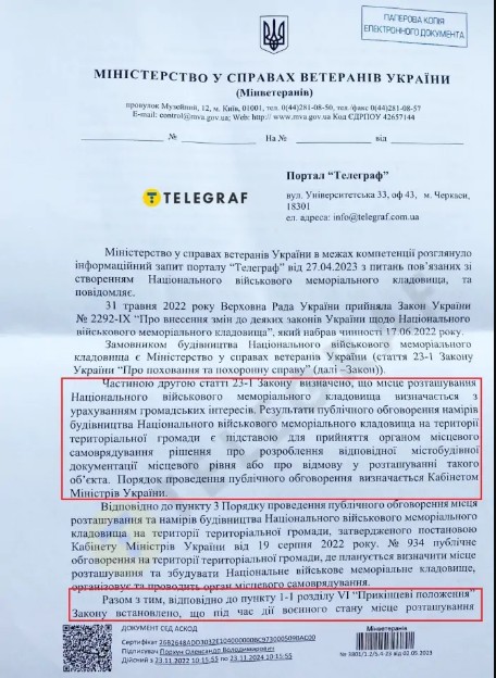 Щоб зрозуміти, як в уряді ставляться до такої гострої реакції суспільства на проект, "Телеграф" звернувся із офіційним запитом до Міністерства у справах ветеранів України, яке виступає замовником будівництва військового кладовища.