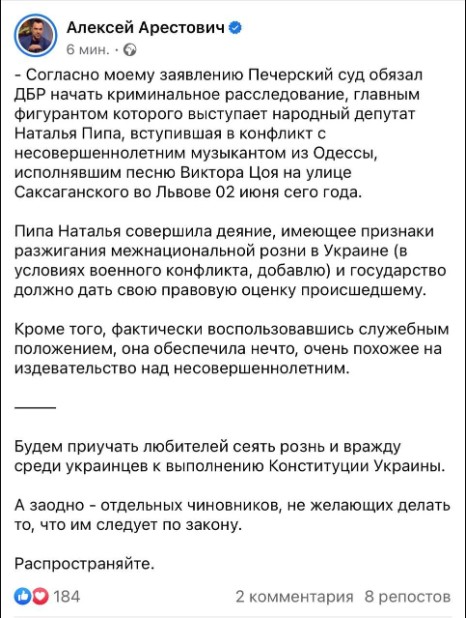 Державне бюро розслідувань (ДБР) зобов'язали розпочати кримінальне провадження, головним фігурантом якого є народний депутат Наталія Піпа, котра зробила зауваження виконавцю пісень Віктора Цоя у Львові. Відповідне рішення ухвалив Печерський районний суд Києва за заявою екс-радника Офісу президента Олексія Арестовича. Про це він повідомив у Telegram, опублікувавши витяги з документів.