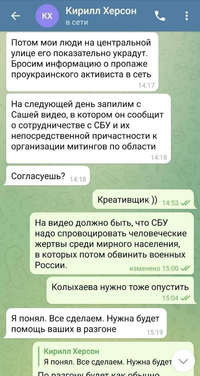 Зрадник зливав інформацію про місцевих патріотів, надавав дані про розташування блокпостів та кількість людей на них, а також обговорював провокації під час мітингів за Україну в Херсоні.