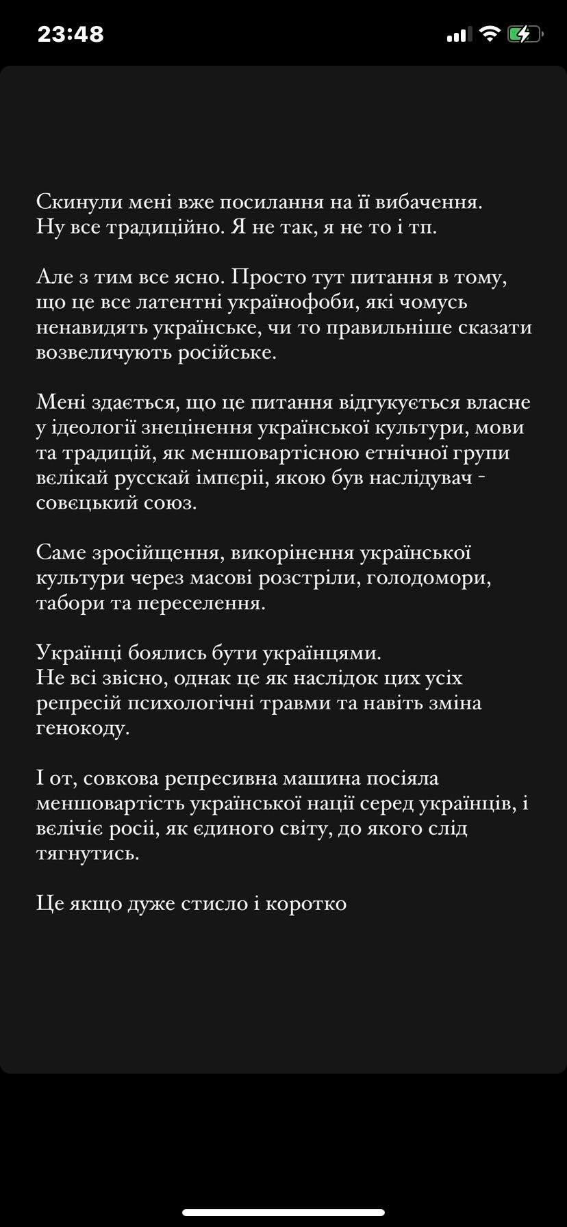 "Скинули мені вже посилання на її вибачення. Ну все традиційно. Я не так, я не то і тд",- написав Роман.