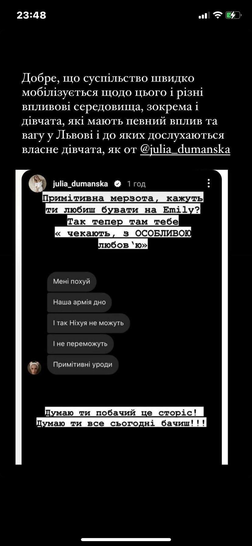 Такі дописи дівчини обурили людей. Зокрема співачка Юлія Думанська зазначила, що у популярному закладі "Emily” де вочевидь блогерка любить бувати, її чекають "з особливою любов’ю".